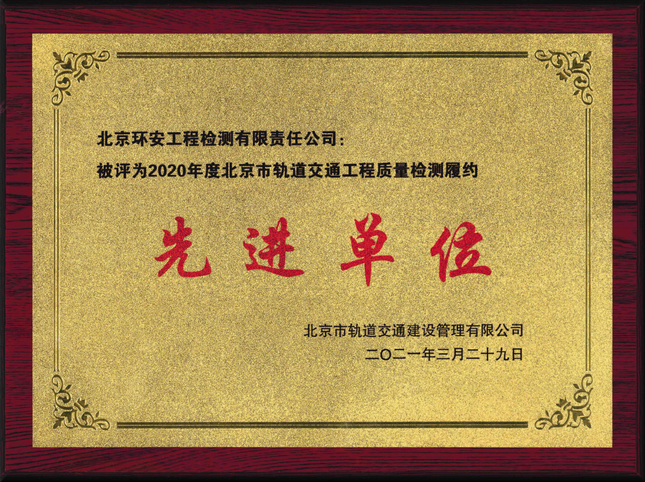 環(huán)安公司獲北京市軌道交通行業(yè)2020年度質(zhì)量檢測履約先進(jìn)單位
