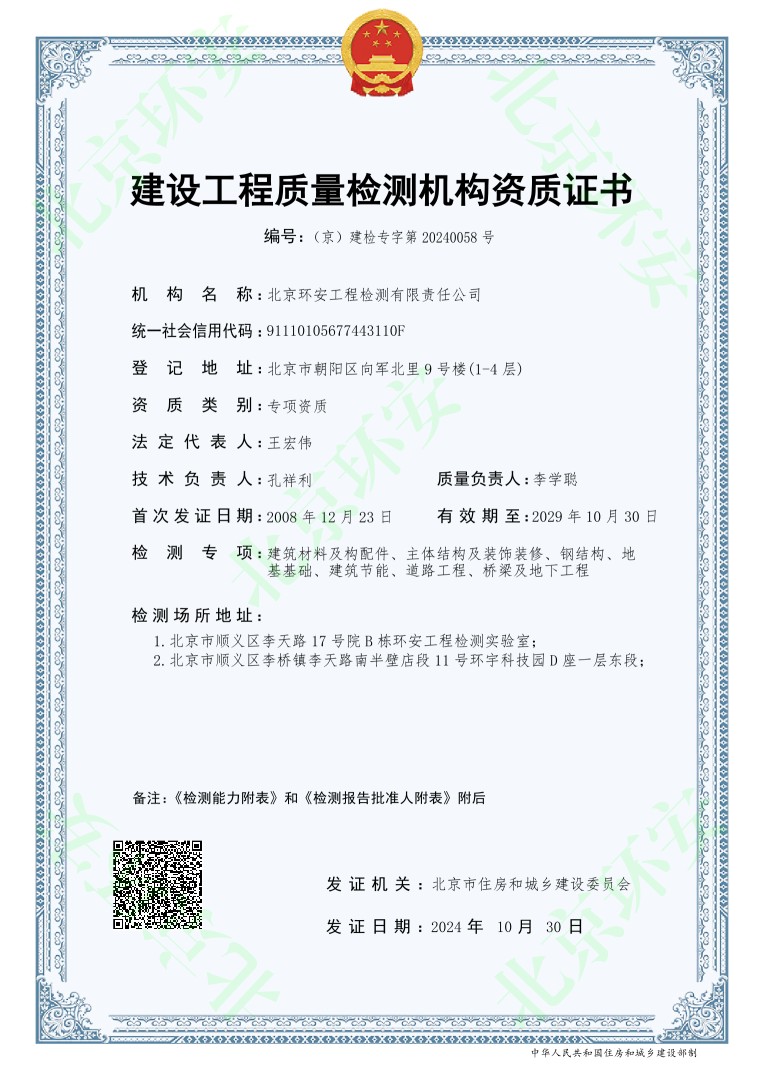 在北京城建集團和北京城建設計發(fā)展集團兩級領導大力支持下,北京環(huán)安工程檢測有限責任公司(以下簡稱“環(huán)安公司”)于2024年10月30日獲批新的建設工程質量檢測機構資質證書,由原有3個檢測專項擴7個檢測專項,包括:主體結構及裝飾裝修、鋼結構、地基基礎、建筑材料及構配件、建筑節(jié)能、道路工程橋梁地下工程其中,后四項為新增檢測專項經(jīng)過近兩年的努力,現(xiàn)已滿足申請檢測綜合資質的基本要求。環(huán)安公司將再接再厲,爭取成為北京市第一批擁有檢測綜合資質的檢測機構。